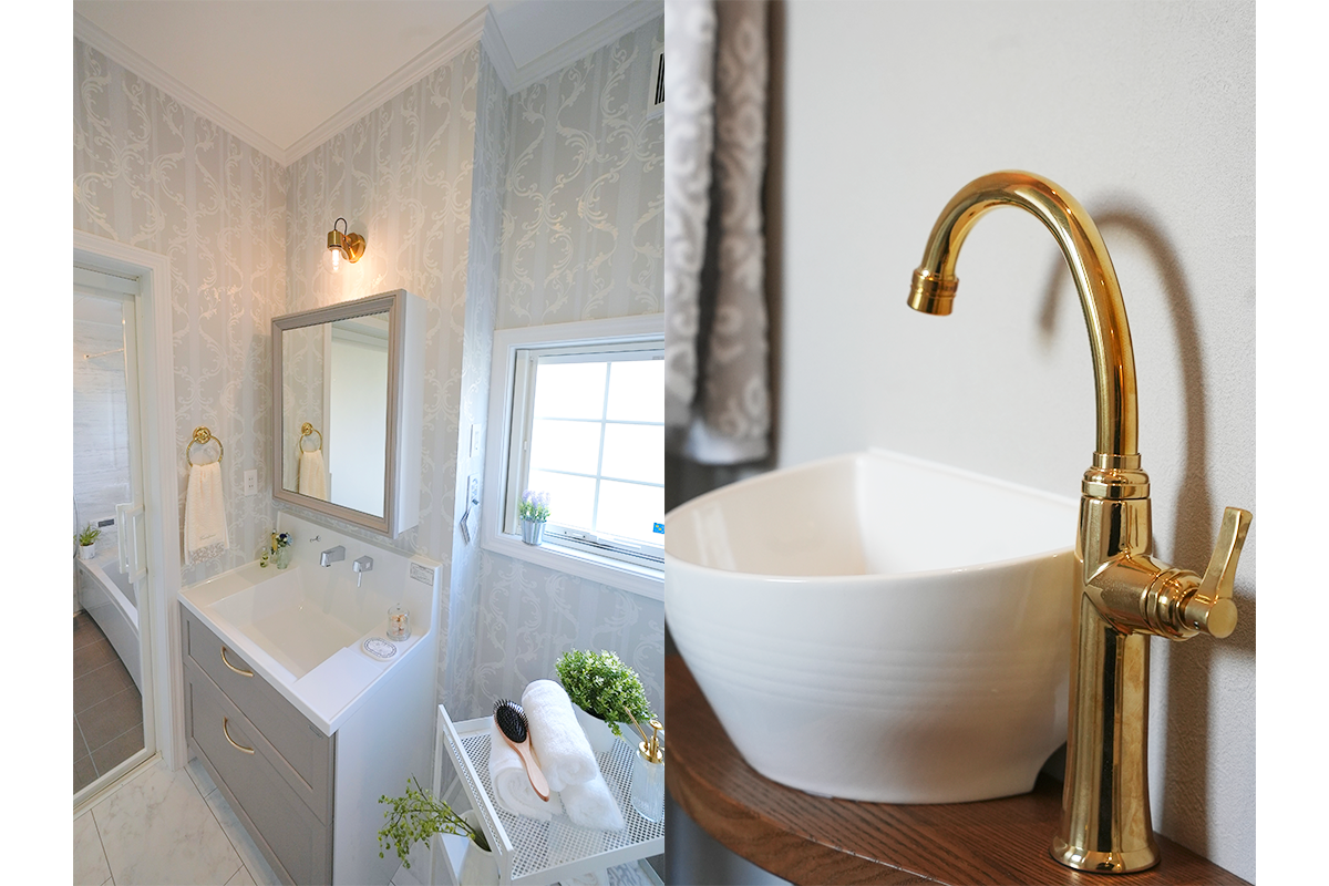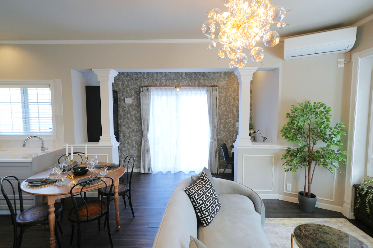 落ち着いたトーンでまとめつつゴージャスな装飾を施した、甘すぎない『大人エレガント』がコンセプトのガレージハウス。