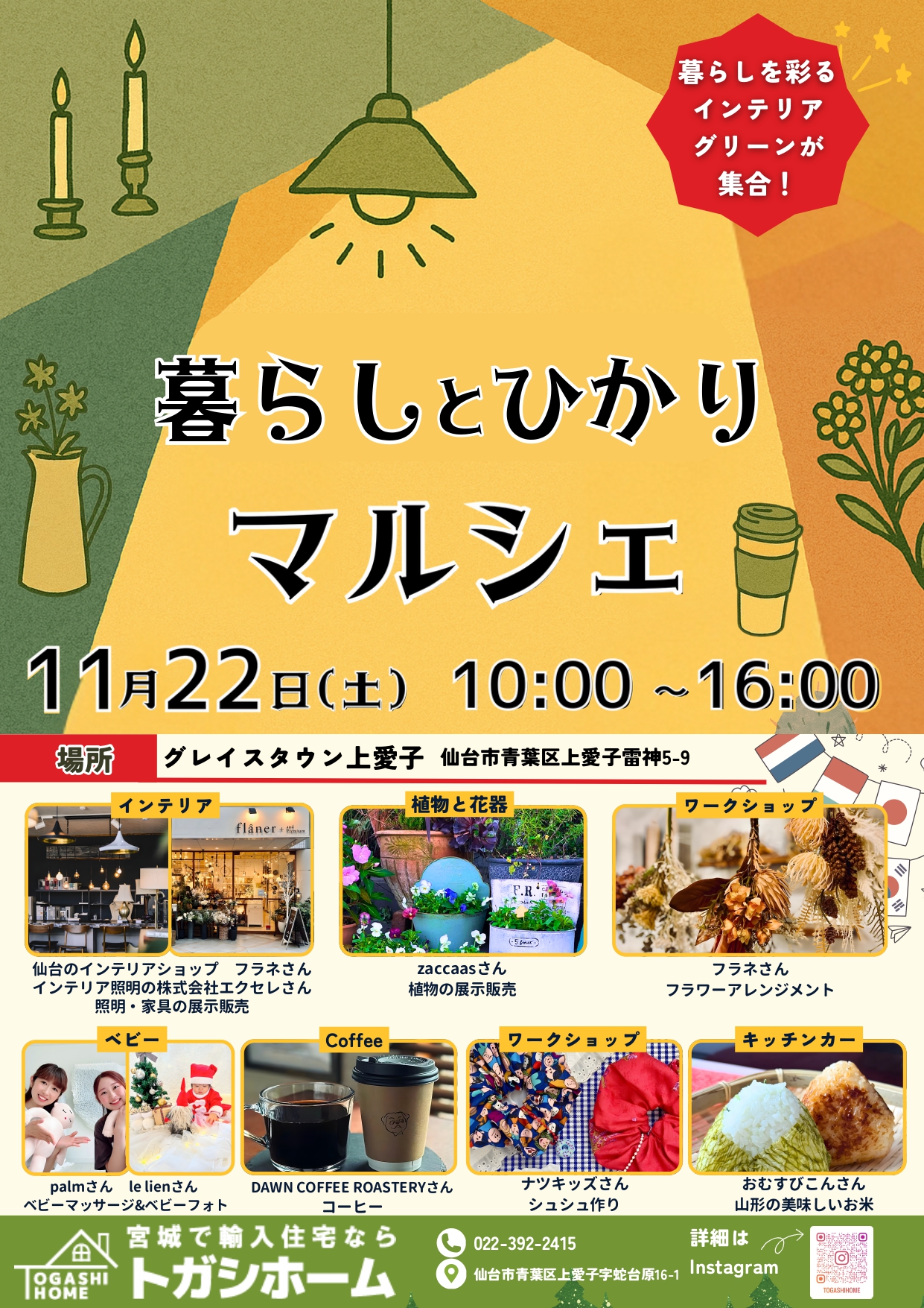 そして当日は仙台で人気のインテリア・照明ショップ、素敵な植物、美味しいコーヒーやキッチンカー、